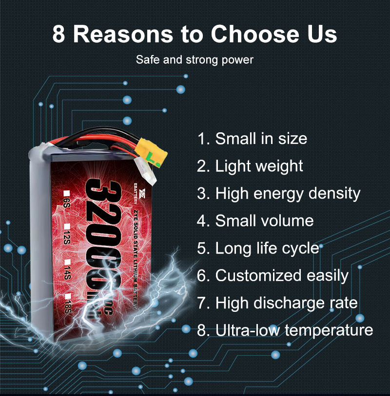 Инновациялық технология: жартылай қатты күйдегі аккумуляторлық батареялардың соңғы шешімдері, соның ішіндеДрондарға арналған қайта зарядталатын 3s4s6S 6500mah жартылай қатты күйдегі батарея, кішкентай UAV-нің энергетикалық қажеттіліктерін қанағаттандыруға арналған.