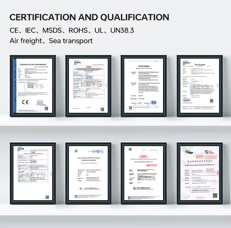 БіздіңЖаңа қатты күйдегі батареяларХалықаралық стандарттарға сәйкес келеді, қауіпсіздік пен сенімділікті қамтамасыз ету үшін сертификатталған: